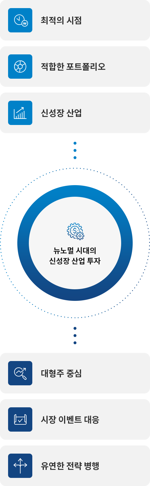 가장 좋은 시점에 가장 적합한 포트폴리오를 바탕으로 뉴노멀 시대의 신성장 산업에 투자하는 펀드입니다. 새로운 산업의 흐름에 맞는 종목을 발굴하여 신성장 섹터의 대형주 위주로 집중 투자하며, 시장의 각종 이벤트에 적극적으로 대응하여 시장환경의 영향을 덜 받는 투자전략을 병행합니다.