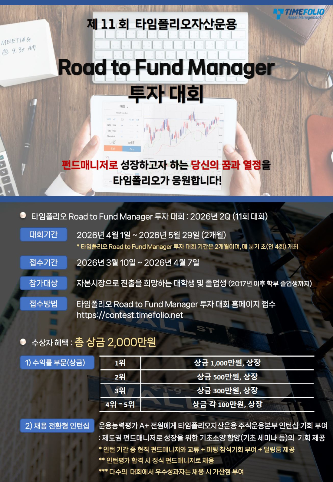 타임폴리오자산운용은 명실상부 펀드매니저의 등용문이 된 '로드 투 펀드매니저(Road to Fund Manager) 모의투자 대회'를 11번째로 진행한다고 3일 밝혔다. 2026년 2분기에 해당하는 이번 대회는 4월 1일부터 5월 29일까지 2개월간 열리게 되며, 접수는 오는 4월 7일까지 받는다.