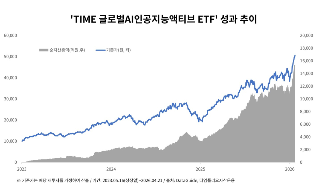 한국거래소에 따르면 21일 종가 기준 ‘TIME 글로벌AI인공지능액티브’ ETF는 2023년 5월 상장 이후 누적수익률이 403.30%를 기록했다. 상장 2년 11개월 만의 성과다. 동시에 순자산총액은 1조5786억원으로 국내 상장된 주식형 액티브 ETF 중 AUM 1위로 뛰어올랐다.